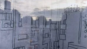 This work addresses the encounter of these two realities, projected one to the other in the gallery space. The first video projection is of a drawing of a place, a still image made from ink pressed into paper, a line of thought. It is the result of contemplation, observation and a conclusion drawn from a period of extended concentration. The second projection is of six video sequences of six journeys, sourced almost randomly from the internet – that represent the globally dispersed references cumulatively building on-line into a shared, uploaded mirror-world. The suspended frame defines a space where both these versions of a place and time meet, rather than being overlaid - one over the other, here they encounter each other from the opposite side, they come up against each other, converging on the thin membrane of the projection film.